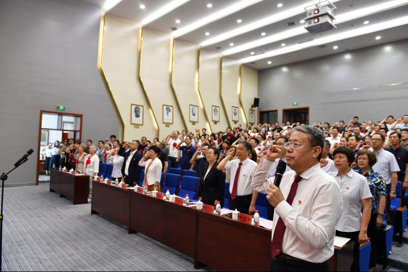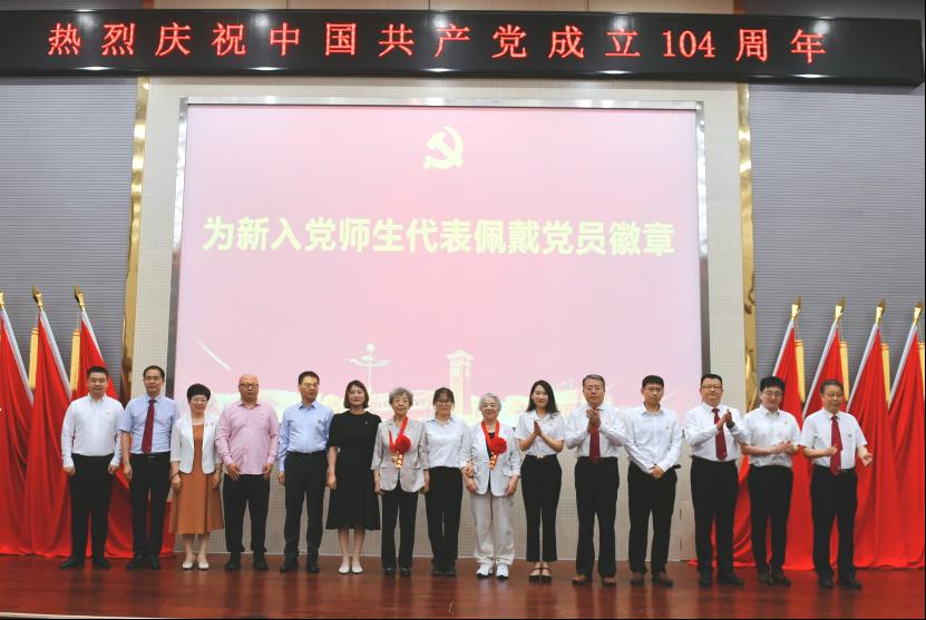 校领导班子成员和两位老党员代表为新党员代表佩戴党员徽章。随后,在党委书记刘革生同志的带领下,新党员代表进行入党宣誓,与会党员一同重温入党誓词。