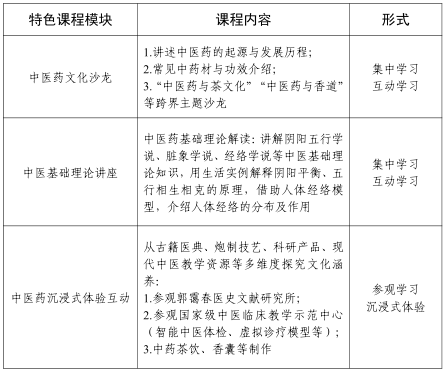 打造中医药特色教育培训矩阵,由中医学院承办,设置中医药文化沙龙、中医基础理论讲座、中医药沉浸式体验互动等特色教育培训模块,培训内容涵盖中医药的起源与发展、常见中药材功效介绍、智能中医体检等,邀请中医学院专家主讲,非医专业处级领导干部等参加培训。课程设置顺应业务水平与中医药文化“双链条”“一体化”发展思路,让教育培训更加精准有效,党员、干部听起来更解渴、干起来更管用。(培训时间以具体通知为准)