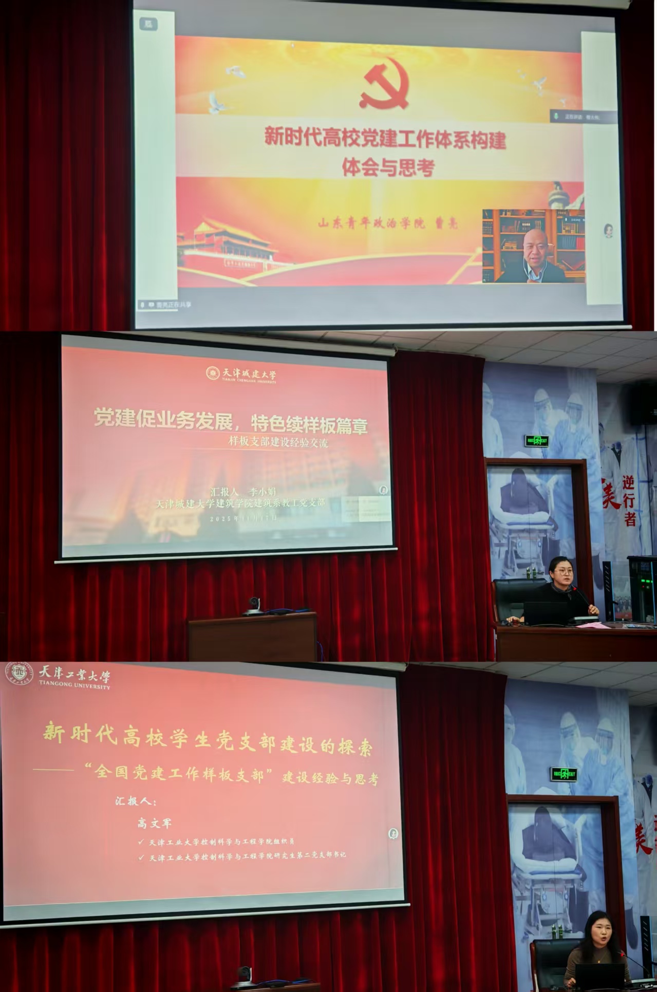 本次培训交流会特邀三位经验丰富的党建领域专家作专题分享。山东青年政治学院正处级组织员、组织部副部长曹亮从高校党建工作体系构建入手,结合评审经验,系统梳理了高校党建“双创”工作的申报要点、评审标准及建设路径,强调以党建引领推动事业高质量发展的重要性。天津城建大学建筑学院副院长李小娟从教工党支部建设实践出发,分享了样板支部培育的典型经验,重点介绍了如何结合学科特色打造党建品牌。天津工业大学正科级组织员高文军聚焦研究生党支部创建,围绕学生党员特点,详细讲解了如何结合学术科研、思政教育、实践育人等维度,凝练研究生党支部建设的特色亮点,并就申报材料的撰写和特色凝练提供了切实可行的建议。